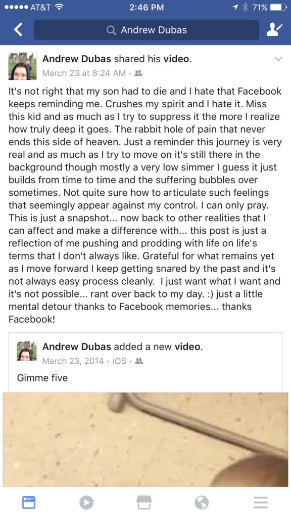 As Caleb’s birthday approaches on April 6th and as much as I try to run from my son’s death, the more I get reminded there’s no other way other than to find healthy ways to process his passing. My default is to suppress and ignore it as mush as I can. The problem is there’s always this undercurrent of truth in the background and that reality always seems to find a way to surface contrary to my best efforts. As an example, last week I pulled up my phone and opened Facebook to clear my notifications and the first in my feed was a “Facebook Memory” from 3 years ago of my son Caleb. Being very tech orientated I proudly posted a lot of video and pictures of my son during his short life on Facebook and I am now plagued with reminders on Facebook from years past and just last week a reminder video I don’t recall seeing or taking popped up and I felt compelled to watch. The first few seconds were OK but I found myself flashing back and then getting angry about his loss of which led to this Facebook post: