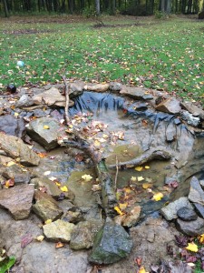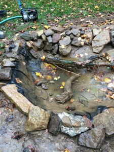 I placed the pump back in place and reattached the hoses with great care and determination while hoping the whole time that my gasoline transfusion would be the cure for this pump to do its job. I opened the choke and began to pull the starter rope once again and the first few pulls were a bit demoralizing as there was no response. I was reminded of Caleb in that moment so close to the pond where I was desperately giving him CPR in the grass nearby. There was no response from him either. I started to question destroying the pond for a moment. Was God trying to tell me something? I decided to pull one more time and to my excitement the pump sputtered and blew out a large cloud of white smoke but did not start all the way. I eagerly pulled again and the pump sputtered some more but started! It was not strong at first but I quickly shifted gears to the siphon tube where the draining of the pond would begin. I was a little concerned because Aaron had fish in the pond. I don’t think anyone in the house knew what I was up to. I was on a mission. As the pond water began to spill out down hill into the grass, I had a great sense of relief come over me. Though I was not done, I knew I was on my way.